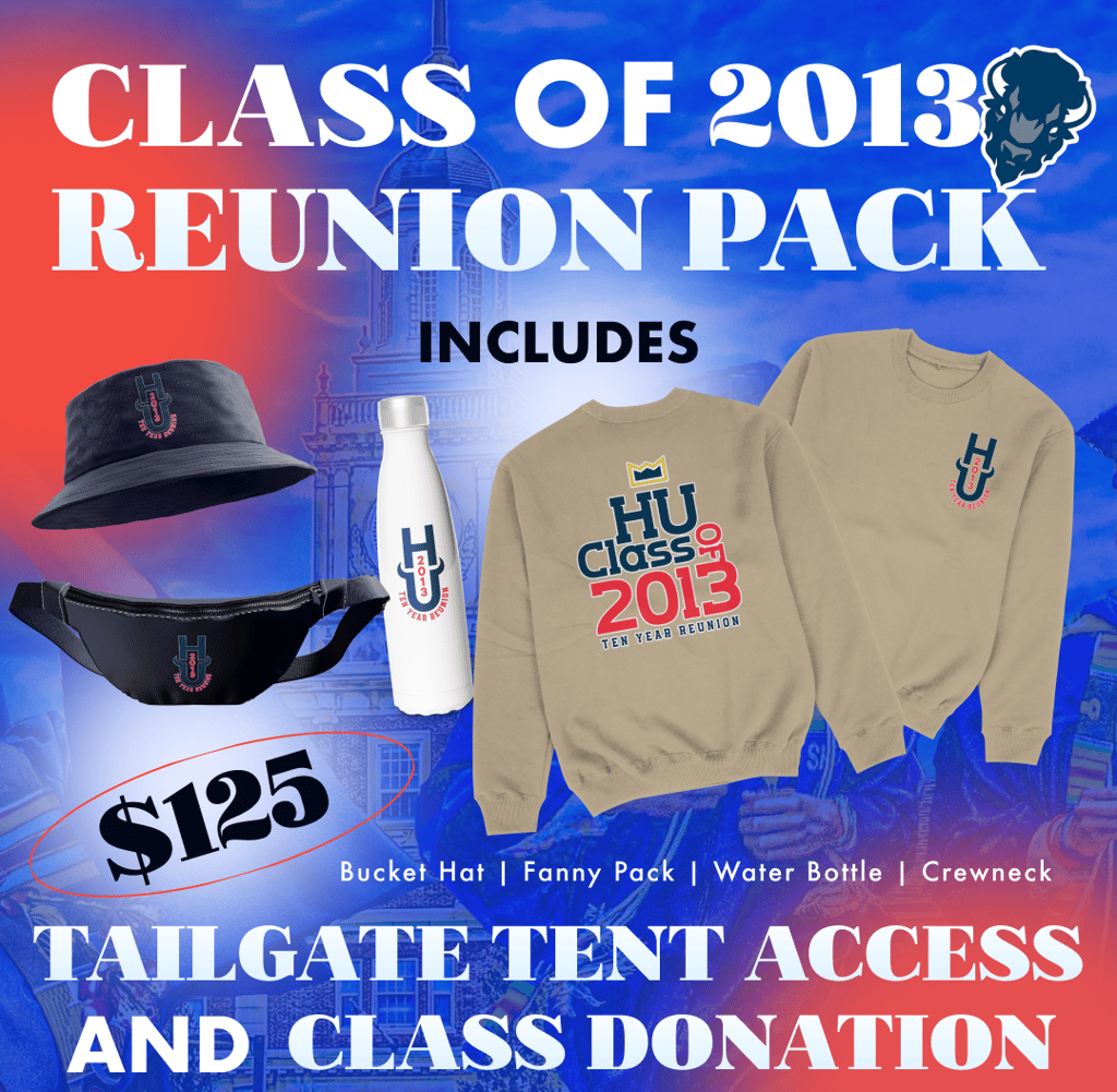 Included in the package is a bucket hat, fanny pack, crewneck sweater, and a thermos bottle. The package also comes with entry to the HU13 Tent during the Tailgate and a class donation.