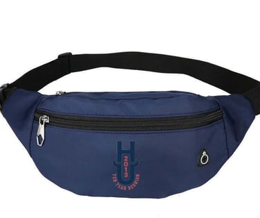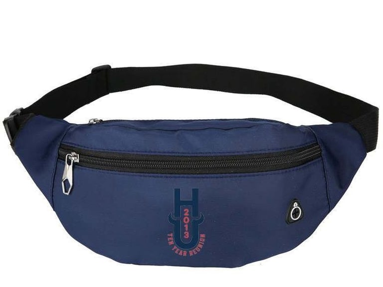 Navy fanny pack sporting a custom embroidered "HU13" logo. Comes with an adjustable strap, 3 pockets, and an insert for headphone jacks.