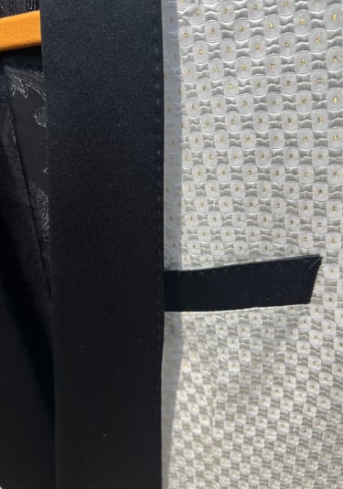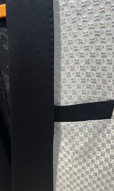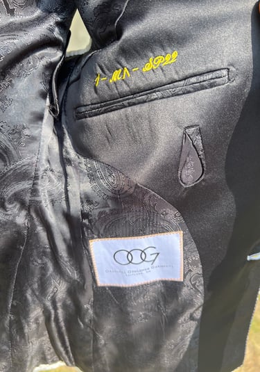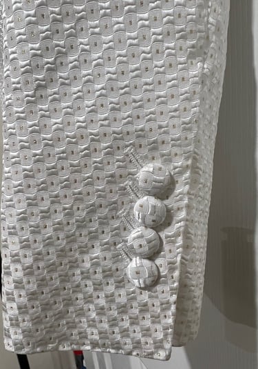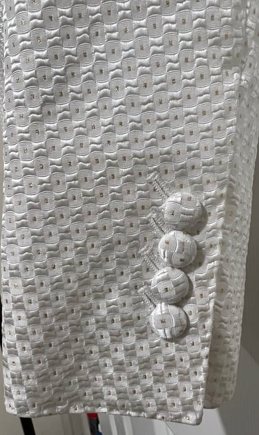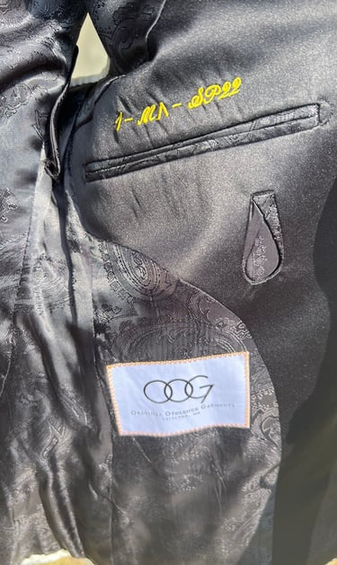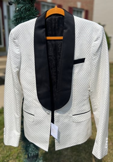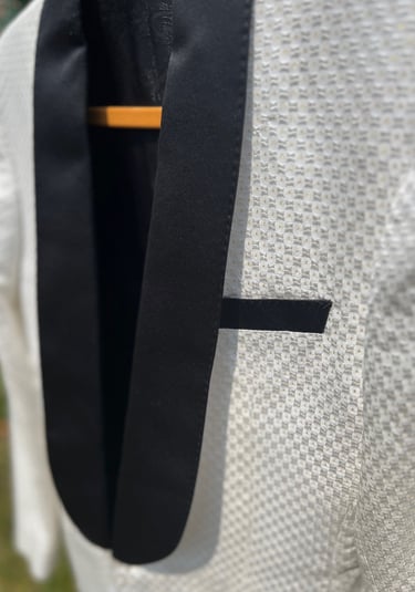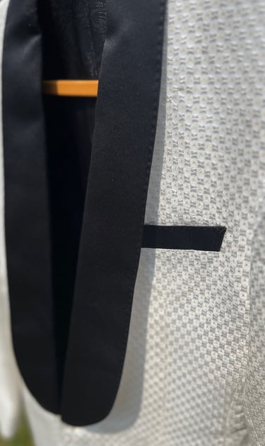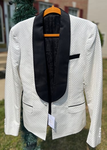 An Opulent white single-button blazer with a black shawl lapel and functional sleeve buttons. Inside will be the option to enter your own monogram.